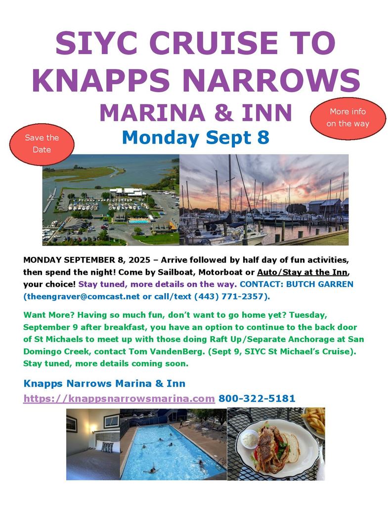 We sailboaters have had an AMAZING fun filled season with many exciting SIYC cruises and events including the Blessing of the Fleet in May, Sailing to Veras in June, Cruise to Corinthian Yacht Club in July, Cruise to SIYC in August; Ted Evans Poker Run, Combo Cruise/Sail to Knapps Narrows and San Domingo Creek (St Michaels) in September. We appreciate all the support we received from sailboaters and from our friends in motorboats. Everyone had a great time!! These are the Remaining Events for 2025 and we are already starting to plan 2026 events!!